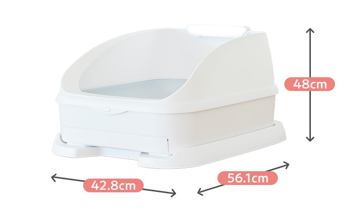 一般的なシステムトイレと同じサイズ トイレのサイズや形状は、一般的な2層式のトイレとほぼ同じ。 ねこと家族がスムーズに使えるよう設計しました。 工具不要で簡単に組み立てができ、丸洗いができるので掃除も簡単。