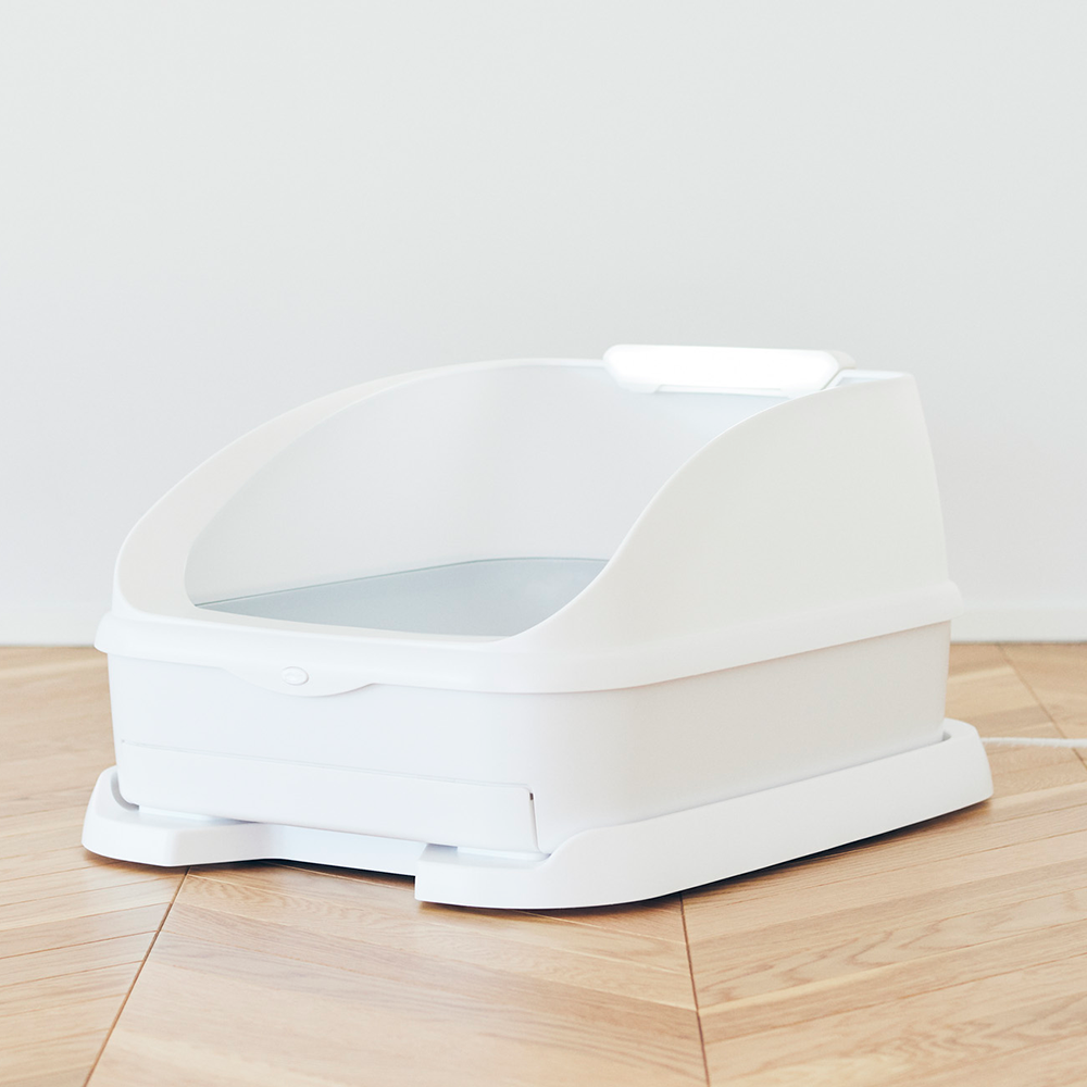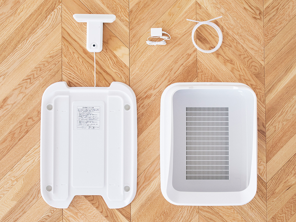 特許取得済み!1g単位で計測できるセンサープレート トイレ本体の下にある「センサープレート」には、1g単位で計測できる4つの重量センサーを搭載しており、特許を取得したねこ専用の計測技術(特許第6560468号)で体重や尿量の小さな重量を計測します。